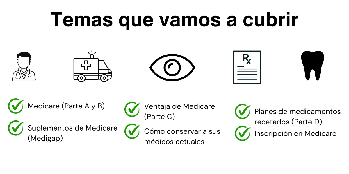 Medicare • Seguro médico • Protección de ingresos por discapacidad • Seguro de vida • Atención a largo plazo • Anualidades • Planificación de jubilación.